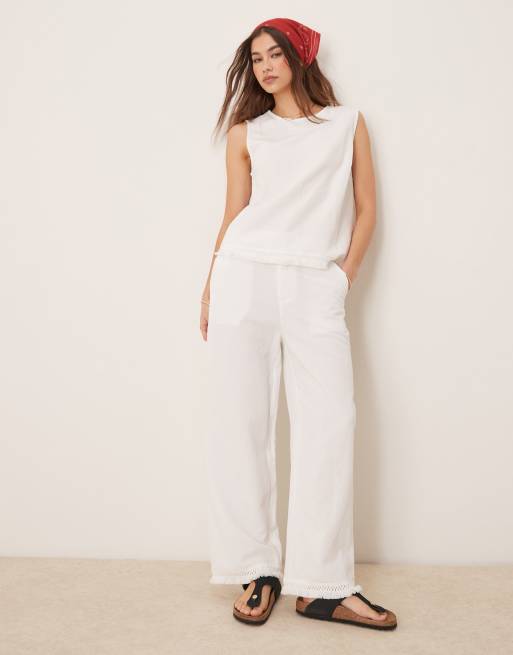 ASOS DESIGN linen blend straight leg trousers with tassel hem co-ord in white