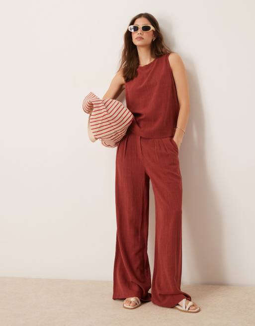 ASOS DESIGN linen pleat front wide leg trousers co-ord in brick red