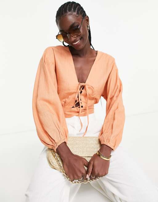 ASOS DESIGN linen top with lace up front & volume sleeve in peach
