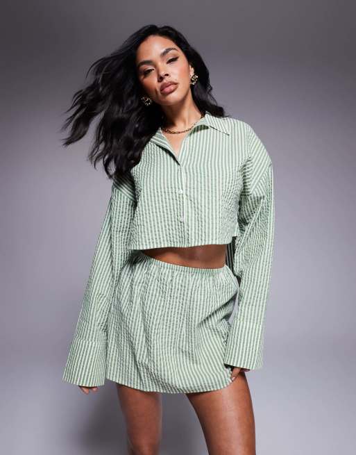 ASOS DESIGN Lisa seersucker cropped beach shirt in green stripe