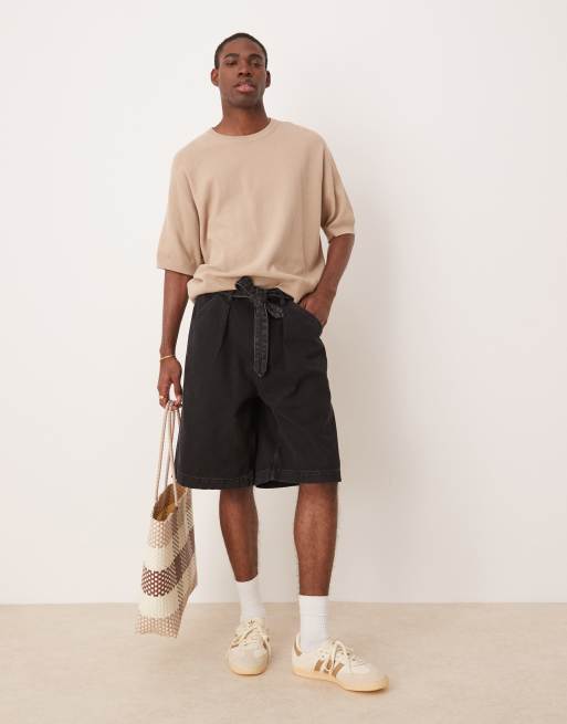 ASOS DESIGN long length denim jort with pleats and self tie in washed black