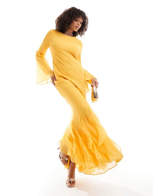 ASOS DESIGN long sleeve bias chiffon maxi dress with ruffles in orange