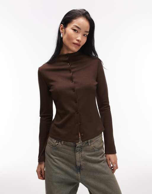 ASOS DESIGN long sleeve buttoned front top in chocolate