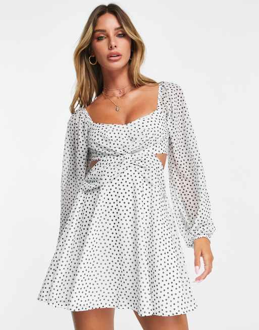ASOS DESIGN long sleeve cut out mini dress in white polka dot