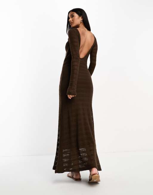 ASOS DESIGN long sleeve maxi crochet dress in chocolate