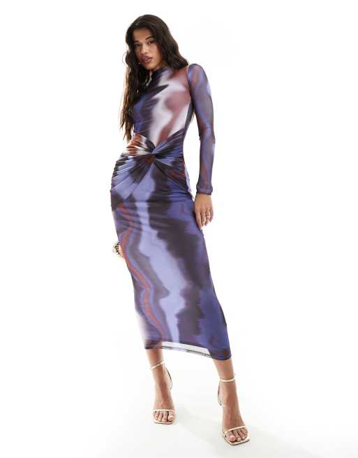 ASOS DESIGN long sleeve mesh maxi dress with ruching in stripe smudge print