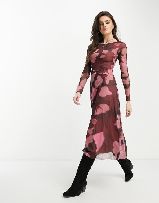 ASOS DESIGN long sleeve midi dress in mesh abstract pink and black floral