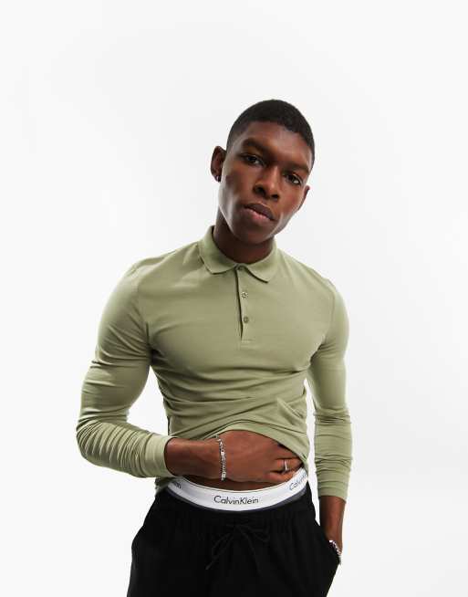 ASOS DESIGN long sleeve muscle polo in washed khaki