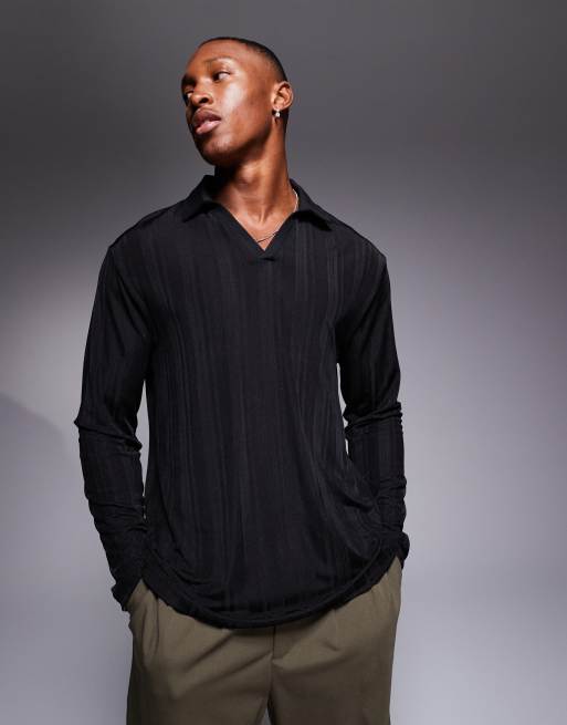 ASOS DESIGN long sleeve polo in sheer rib with deep v neck