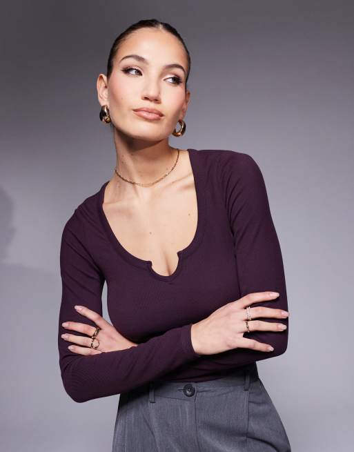 ASOS DESIGN long sleeve ribbed top with notch detail in plum