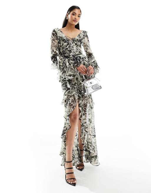 ASOS DESIGN long sleeve ruffle maxi dress with lace inserts in mono floral print
