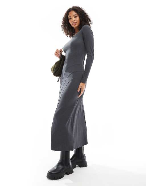 ASOS DESIGN long sleeve scoop neck midi dress with seam detail in charcoal