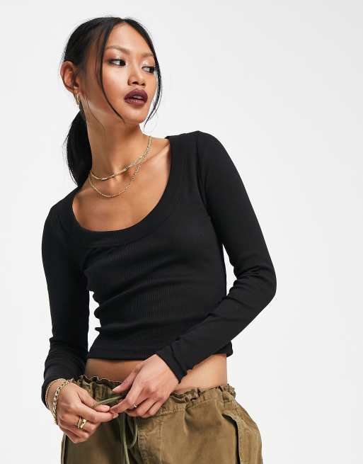 ASOS DESIGN long sleeve scoop neck rib top in black