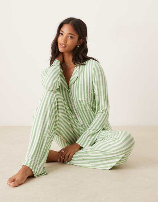 ASOS DESIGN long sleeve super soft pyjama set in green stripe & lilac contrast piping