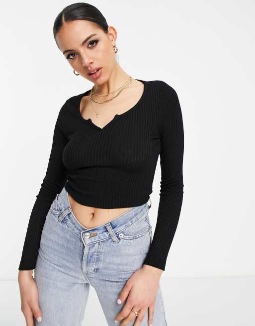 ASOS DESIGN long sleeve top with notch neck in rib in black marl