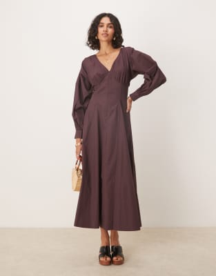ASOS DESIGN long sleeve v neck poplin maxi dress in chocolate