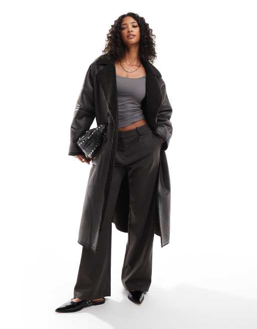 ASOS DESIGN longline shearling jacket with contrast binding in brown