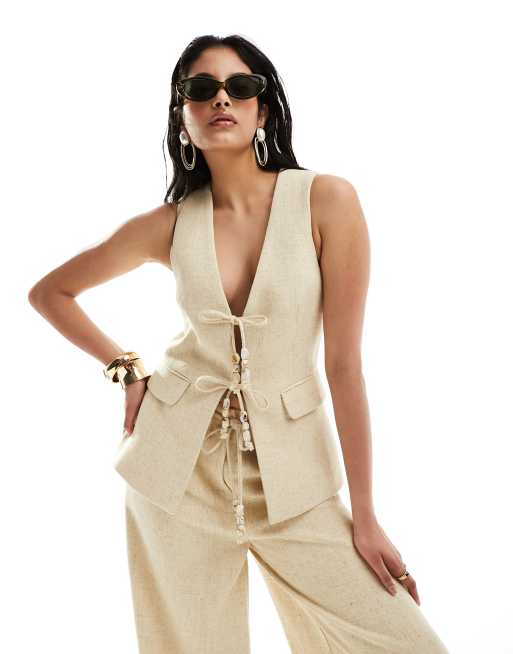 ASOS DESIGN longline waistcoat with beaded tie detail in textured cream