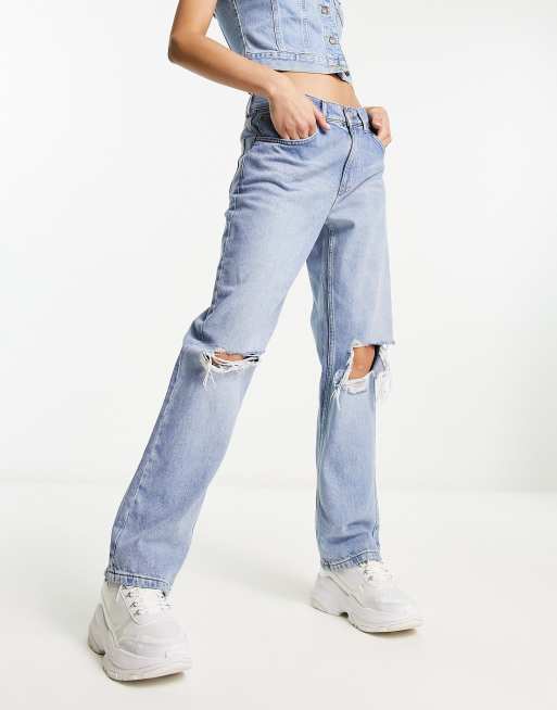 ASOS DESIGN loose straight jeans with knee rips in light blue