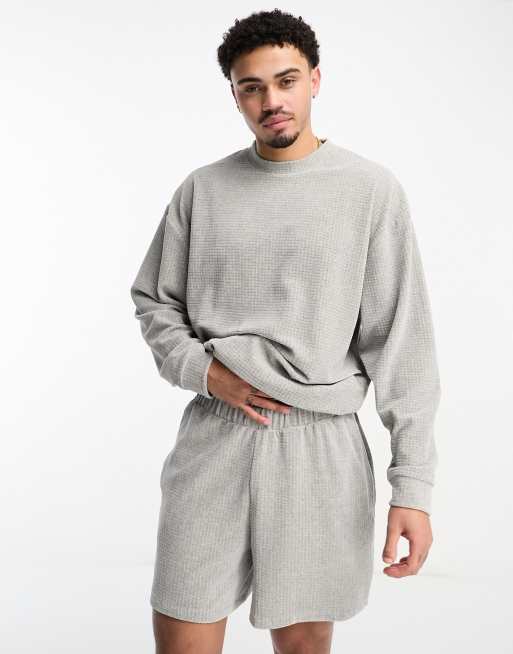 ASOS DESIGN loungewear set with long sleeve top and shorts in grey grid velour texture