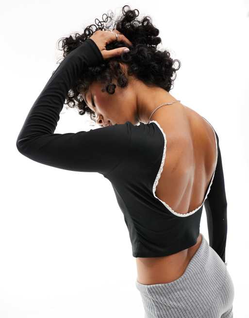ASOS DESIGN low scoop back top with contrast lace trim in black - BLACK