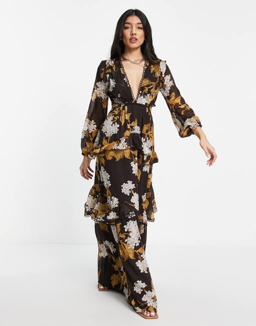 ASOS DESIGN maxi dress with long sleeve and circle trim in floral print and embellishment in chocolate hydrangea print
