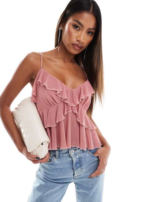 ASOS DESIGN mesh cami top with ruffles in dusty pink