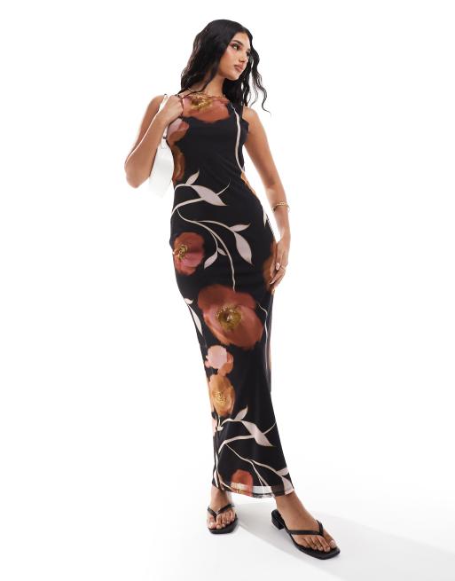 ASOS DESIGN mesh cowl back maxi dress with tie in black floral print