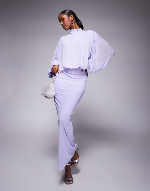 ASOS DESIGN mesh draped blouson long sleeve maxi dress with ruched skirt in lilac