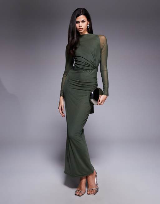 ASOS DESIGN mesh long sleeve twist bust detail halter maxi dress in khaki