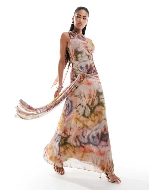 ASOS DESIGN mesh one shoulder mini dress with neck tie in blurred animal print