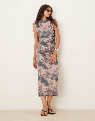 ASOS DESIGN mesh sleeveless ruched midi dress in smudge print