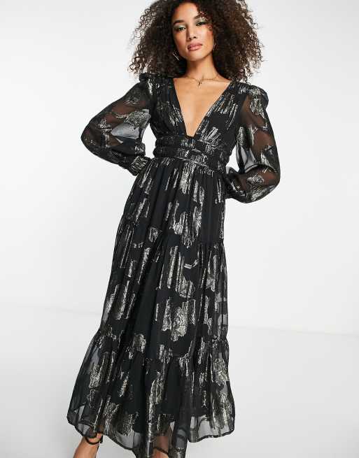 ASOS DESIGN metallic channel detail midi dress with puff sleeves and tie back detail in black