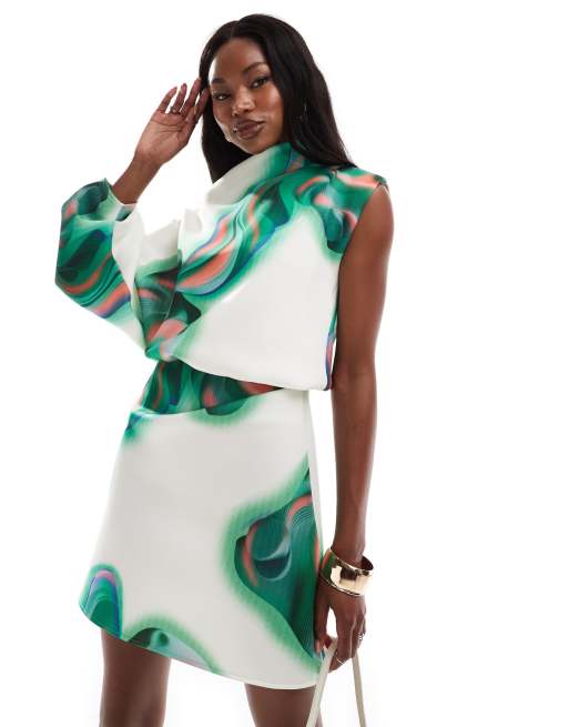 ASOS DESIGN micro mini dress with volume sleeve in abstract marble print in scuba-style fabric