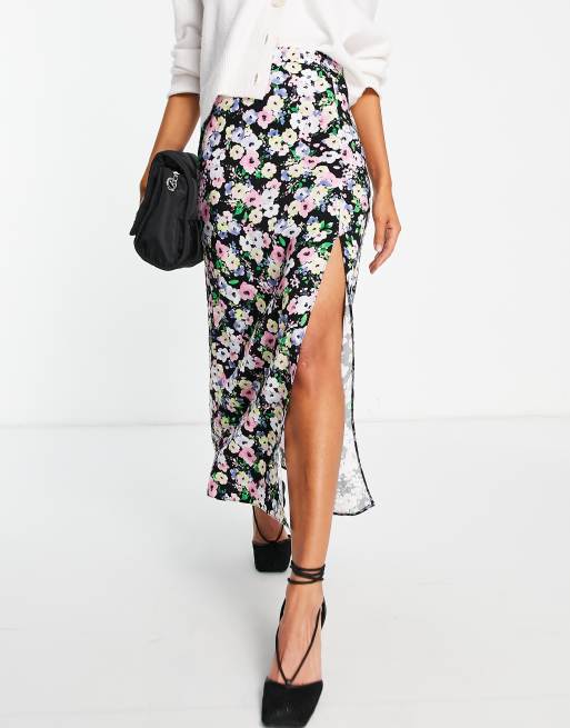 ASOS DESIGN midi skirt with thigh split in dark based floral