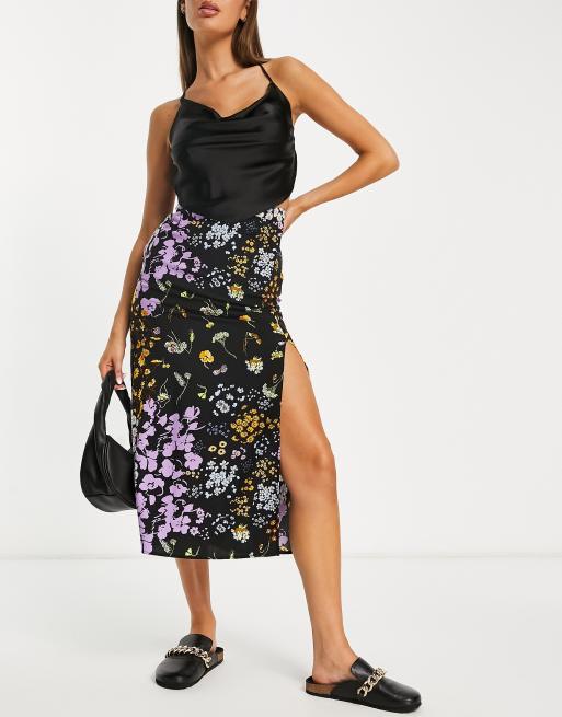 ASOS DESIGN midi slip skirt with thigh split in dark based floral print