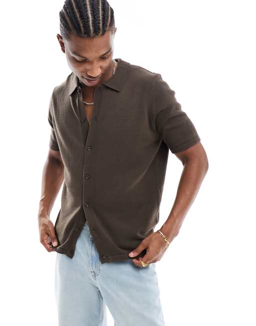 ASOS DESIGN midweight knitted cotton button through polo in brown