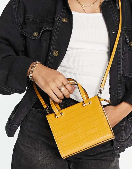 ASOS DESIGN mini croc tote bag with top handle and detachable crossbody strap in mustard