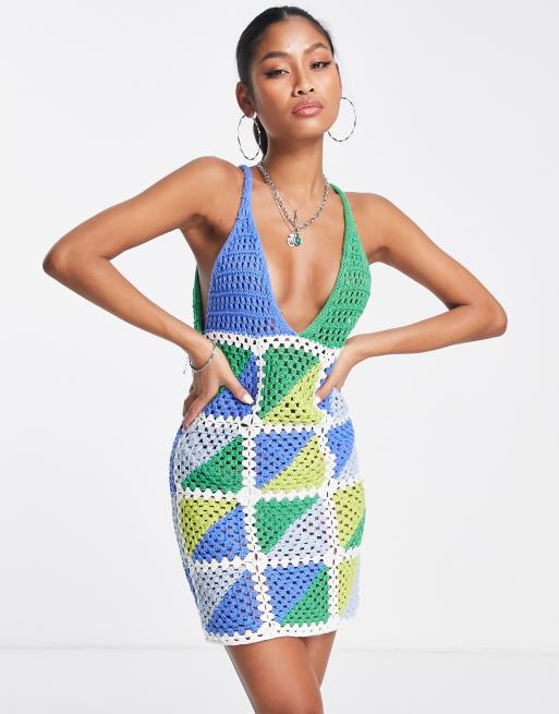 ASOS DESIGN mini crochet dress in blue patchwork