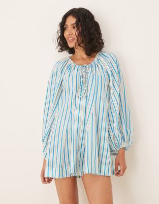 ASOS DESIGN mini dress with scoop neck ruched channel and volume sleeve in stripe