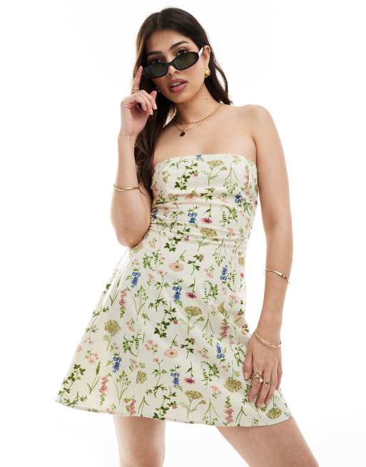 ASOS DESIGN mini linen bandeau sundress in cream botanical floral print