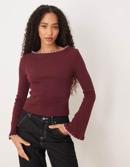 ASOS DESIGN mini rib flare sleeve top with scallop edge detail in plum