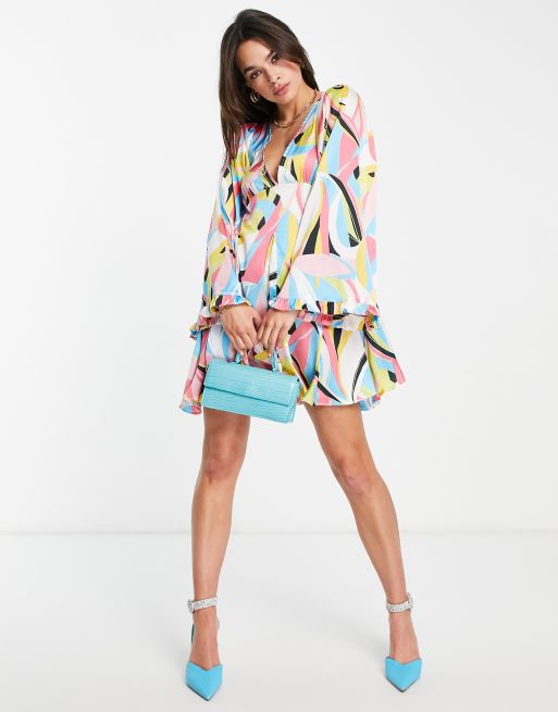 ASOS DESIGN mini smock dress with godets and flared sleeves in swirl print