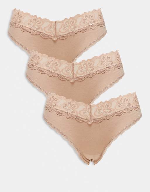 ASOS DESIGN Minnie 3 pack cotton brazilian brief with lace waistband in neutral