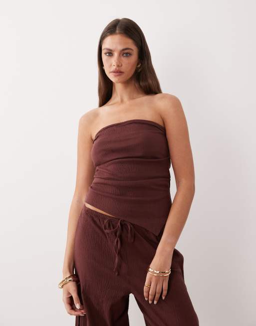 ASOS DESIGN mix & match cotton crinkle asymmetric bandeau top in chocolate