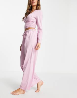 ASOS DESIGN mix & match cotton pyjama long sleeve wrap top in pink - PINK