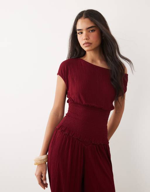 ASOS DESIGN mix & match crinkle shirred off shoulder top in berry