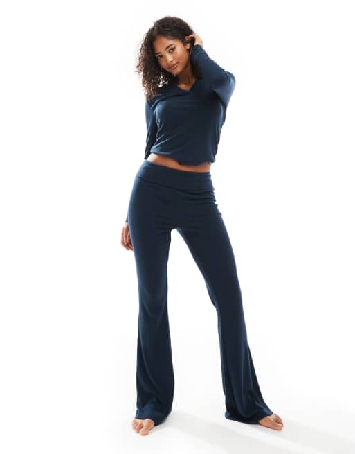 ASOS DESIGN mix & match rib and velvet trim fold over trouser in navy