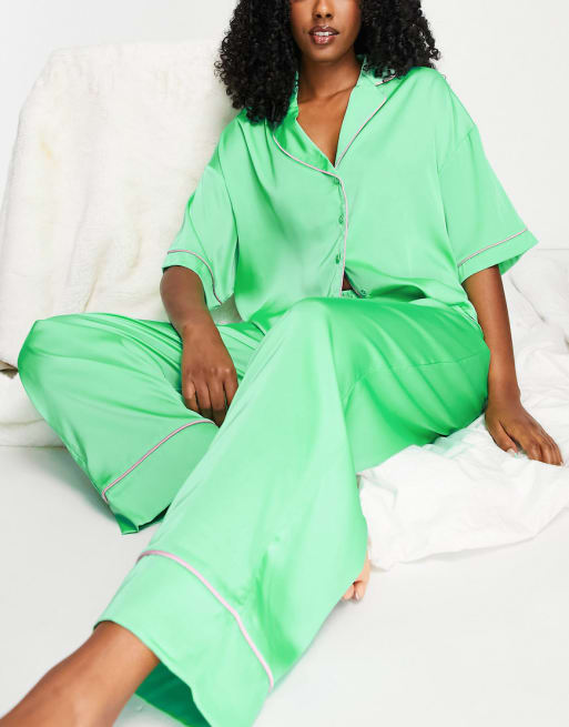 ASOS DESIGN mix & match satin pyjama set with contrast piping in green