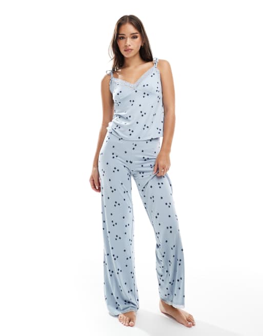 ASOS DESIGN mix & match super soft star print pyjama trouser in blue with lace trim